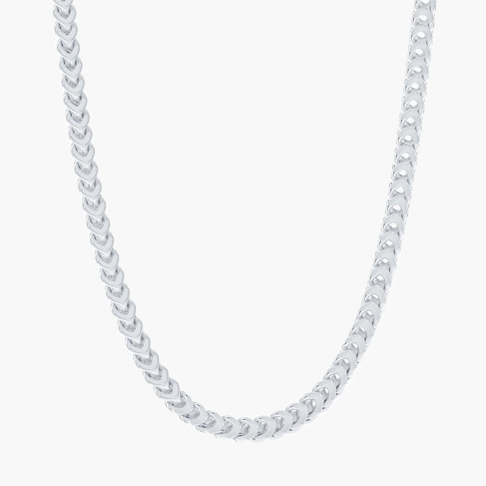 Experience unparalleled Italian sophistication with our 4mm Franco Chain in Rhodium-Plated Sterling Silver. This substantial 120 gauge chain combines strength and elegance, reminiscent of the enduring beauty of Rome's architecture. Available in 20", 22", and 24" lengths, it's perfect for those who appreciate a bold yet refined Italian-inspired statement piece.