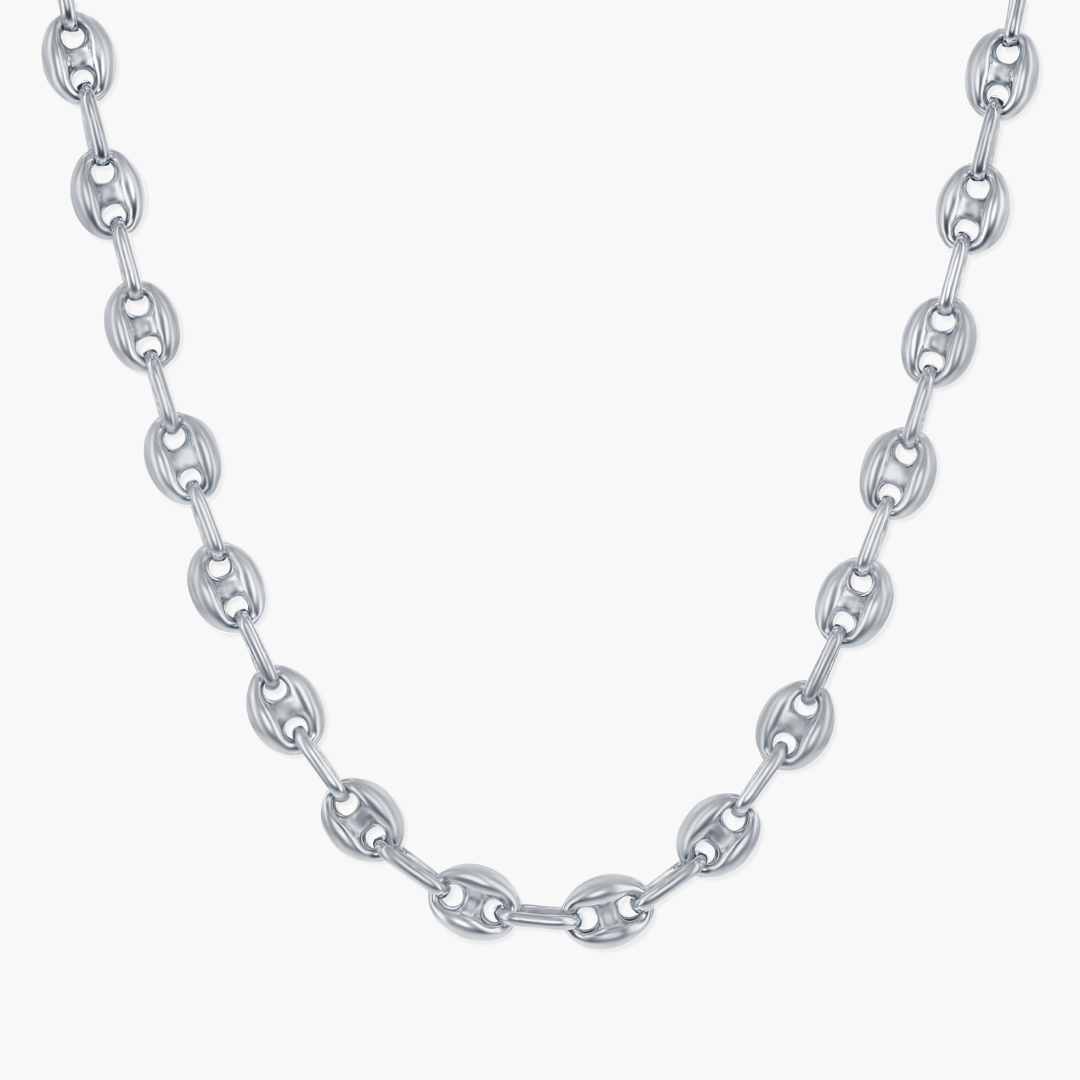 Experience maritime elegance with our 6mm Puffed Marina Chain in lustrous rhodium plate. The dimensional design catches light like moonlight on Mediterranean waves, while the rhodium finish adds contemporary sophistication to this nautical-inspired piece.
