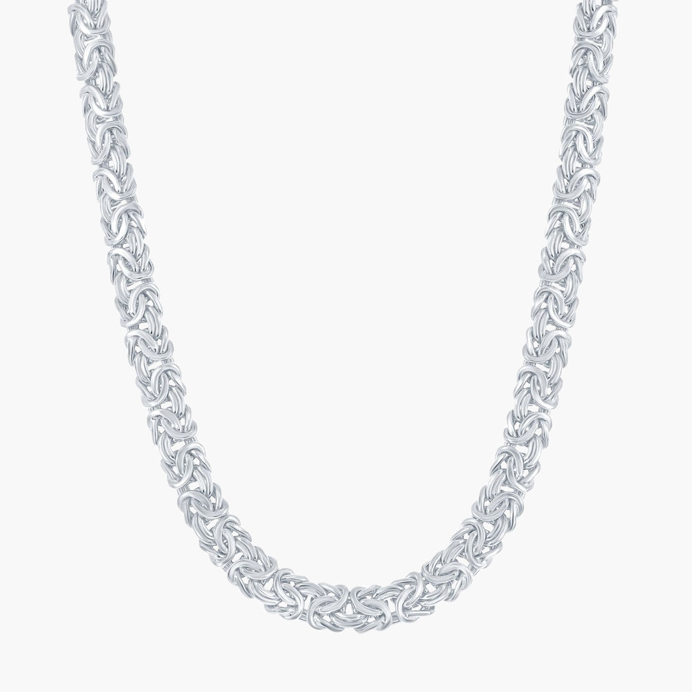 Immerse yourself in the rich history of Italian artistry with our Classic Byzantine Necklace in Rhodium-Plated Sterling Silver. This exquisite 17" piece pays homage to the intricate metalwork of ancient Rome, reimagined for the modern connoisseur. The complex interlocking pattern creates a luxurious, fluid drape that catches the light with every movement. This statement necklace embodies the timeless sophistication of Italian craftsmanship, perfect for elevating both everyday ensembles and evening attire with a touch of Mediterranean allure.